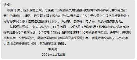 2021年11月26号,接到超星杯高校青年教师校内选拔赛的通知,学院领导对此非常重视,积极的组织青年教师踊跃报名,经过院内选拔,最终王灿青老师和解运超老师代表beat365唯一官方网站参加此次比赛。