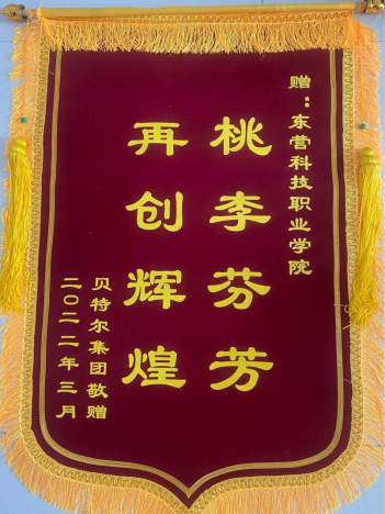 3月23日,广饶贝特尔控股集团副经理张杰莅临beat365官网,并赠送“桃李芬芳 再创辉煌”锦旗,beat365官网刘永峰校长、安丰金院长和李平主任参加了此次活动。
